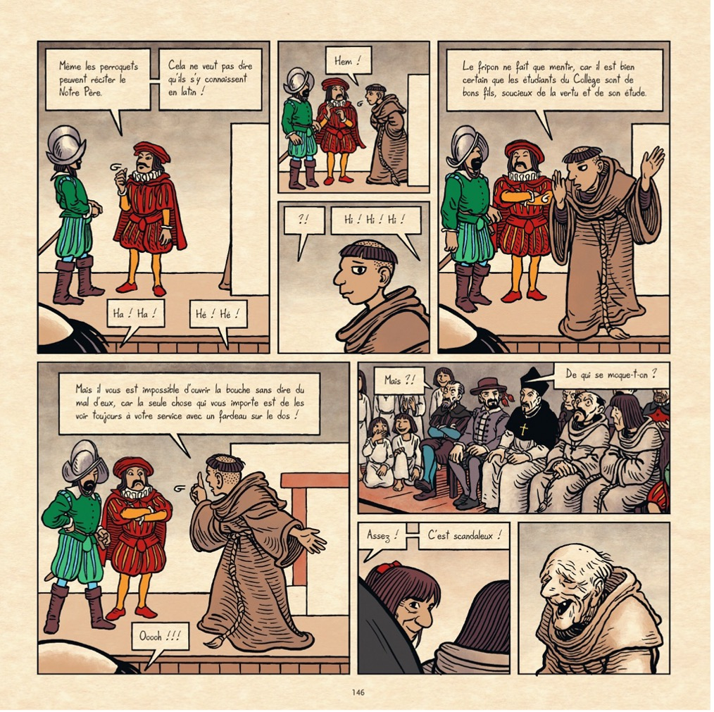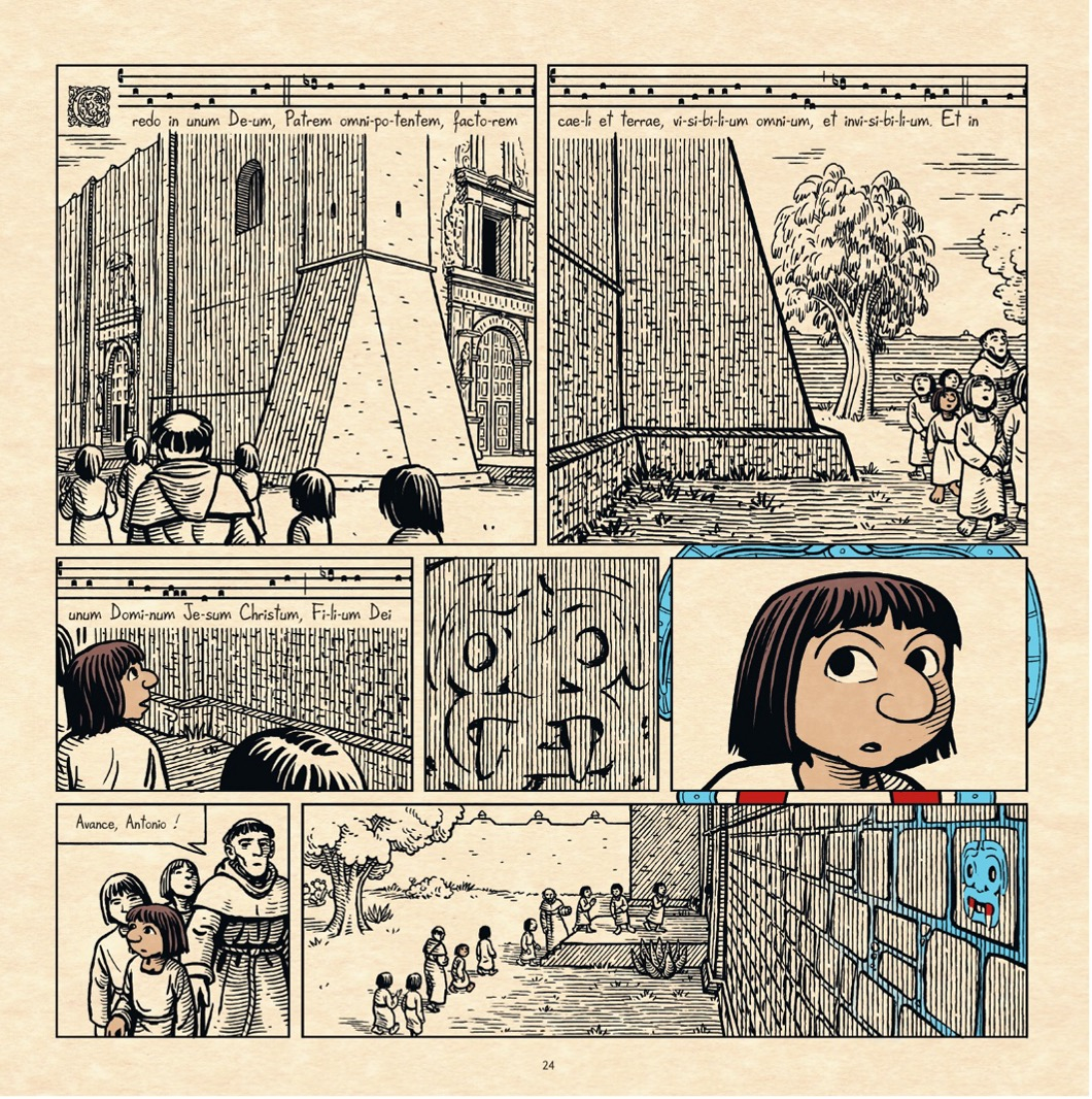 Le but est bien de former des latinistes qui seront ensuite aptes à enseigner eux-mêmes le latin pour continuer l’évangélisation. Mais l’album montre surtout Antonio enseignant la langue latine et les subtilités de la littérature latine classique. Les pages 26-27 offrent un complet renversement des valeurs européocentrées car c’est le jeune Antonio, debout, avec une posture d’enseignant, qui maîtrise le latin et l’enseigne à ses condisciples plus jeunes assis sur le sol autour de lui[17] ; et ce sont deux Espagnols qui observent la scène de loin qui sont incapables, en revanche, de comprendre un traître mot à ce qu’ils ont entendu :