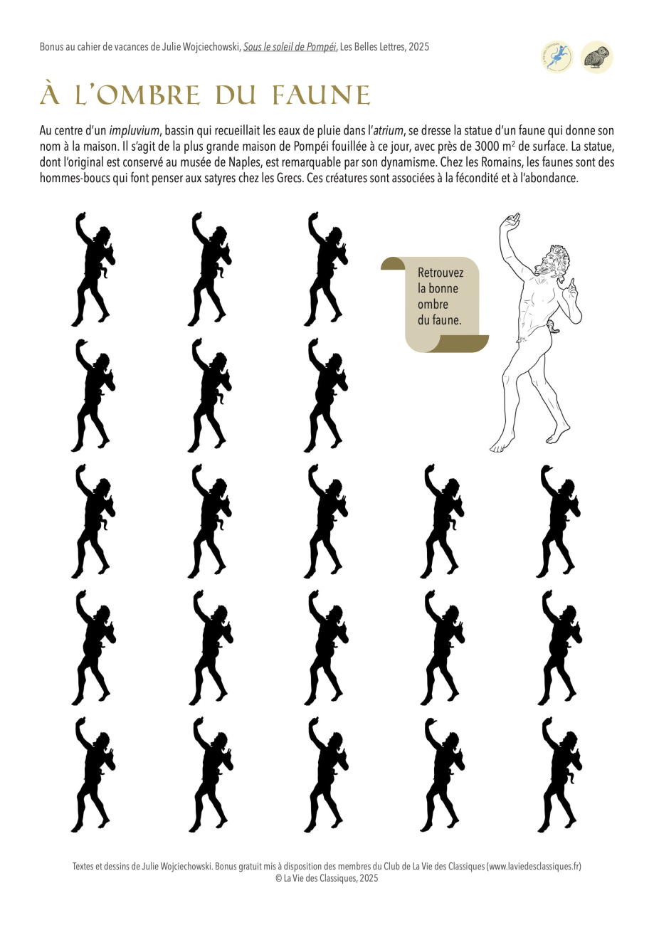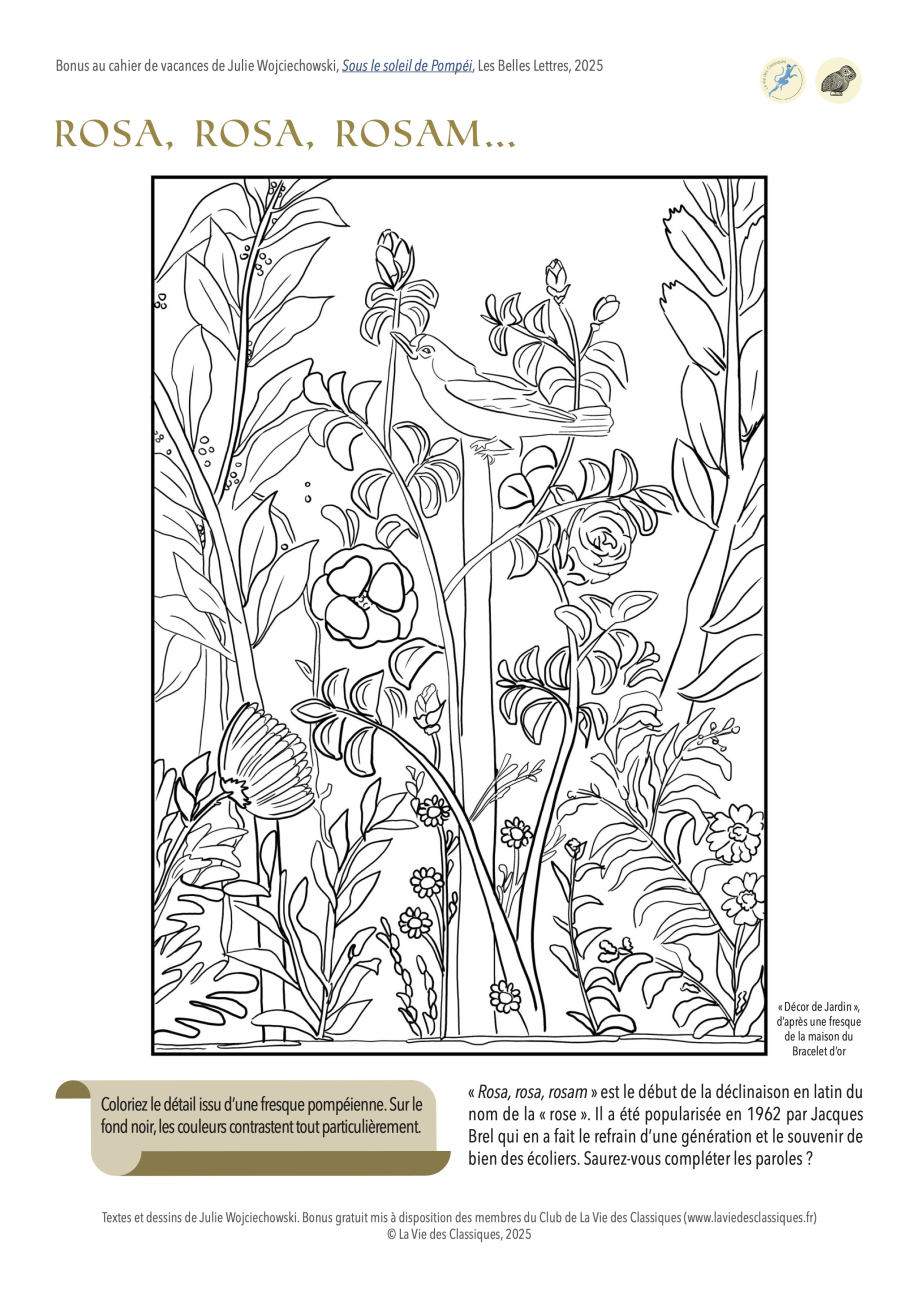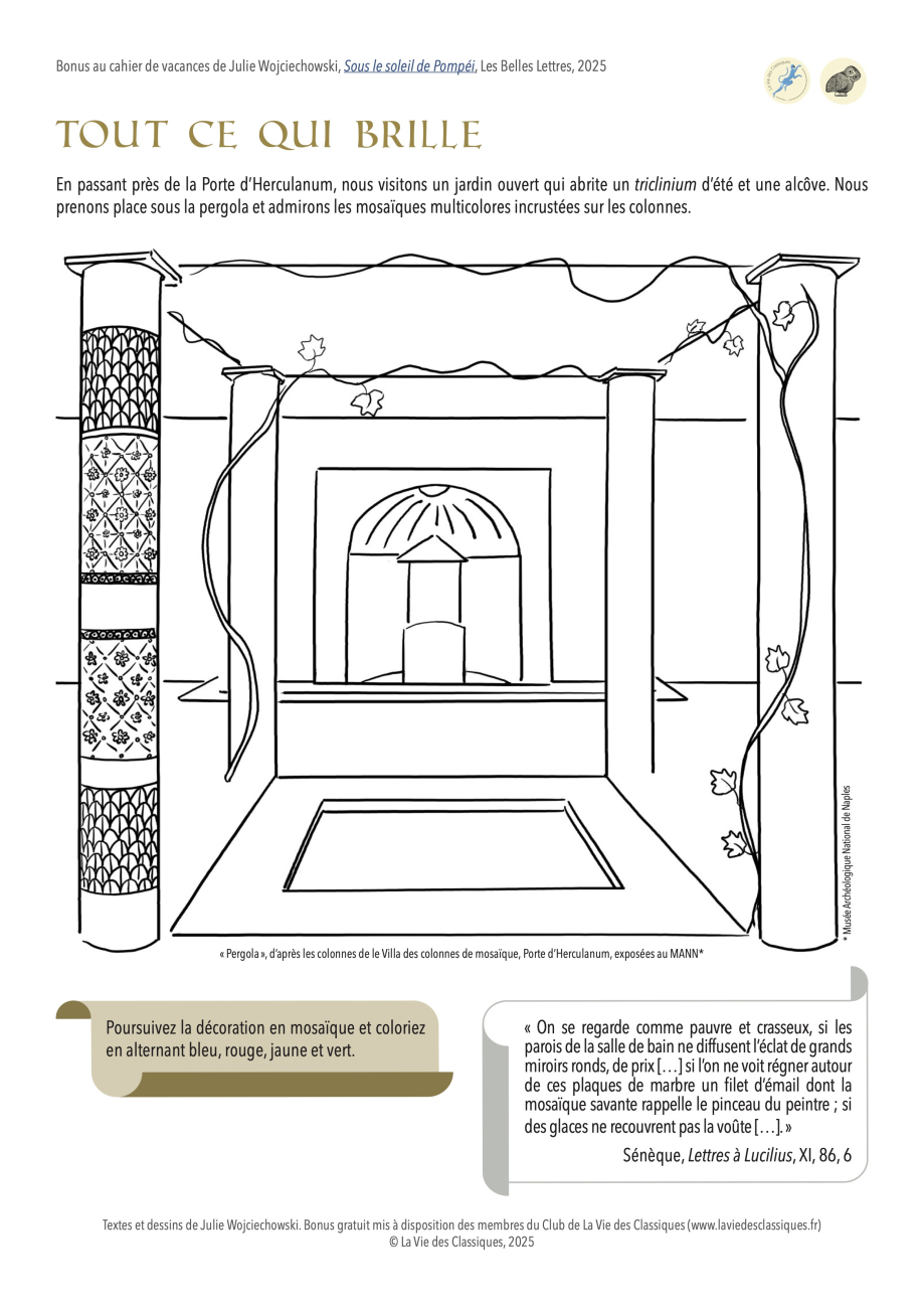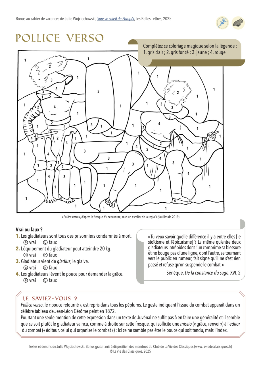 Retrouvez sur cette page, pour accompagner votre cahier de vacances Sous le soleil de Pompéi. 100 jeux pour progresser, quelques bonus numériques gratuits. Sept nouveaux jeux s’offrent à vous : vous reconnaîtrez sûrement trois dessins du cahier réinvestis ici en grand format pour que vous puissiez en colorier les moindres détails, ainsi que quatre activités inédites afin de prolonger les vacances !